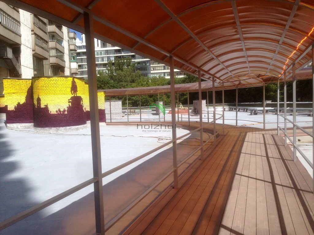 В бизнес-центре на "Войковской" (что на Ленинградском шоссе в Москве) выполнен монтаж переходов между корпусами офисных зданий на кровле. Дорожки выполнены из Универсальной доски из ДПК общей площадью 660 кв.м. Теперь для удобства сотрудников комплекса перейти из одного строения в другие два, занимает не более 1 минуты, а раньше приходилось "путешествовать" по этажам и многочисленным лестничным переходам через первые этажи зданий.