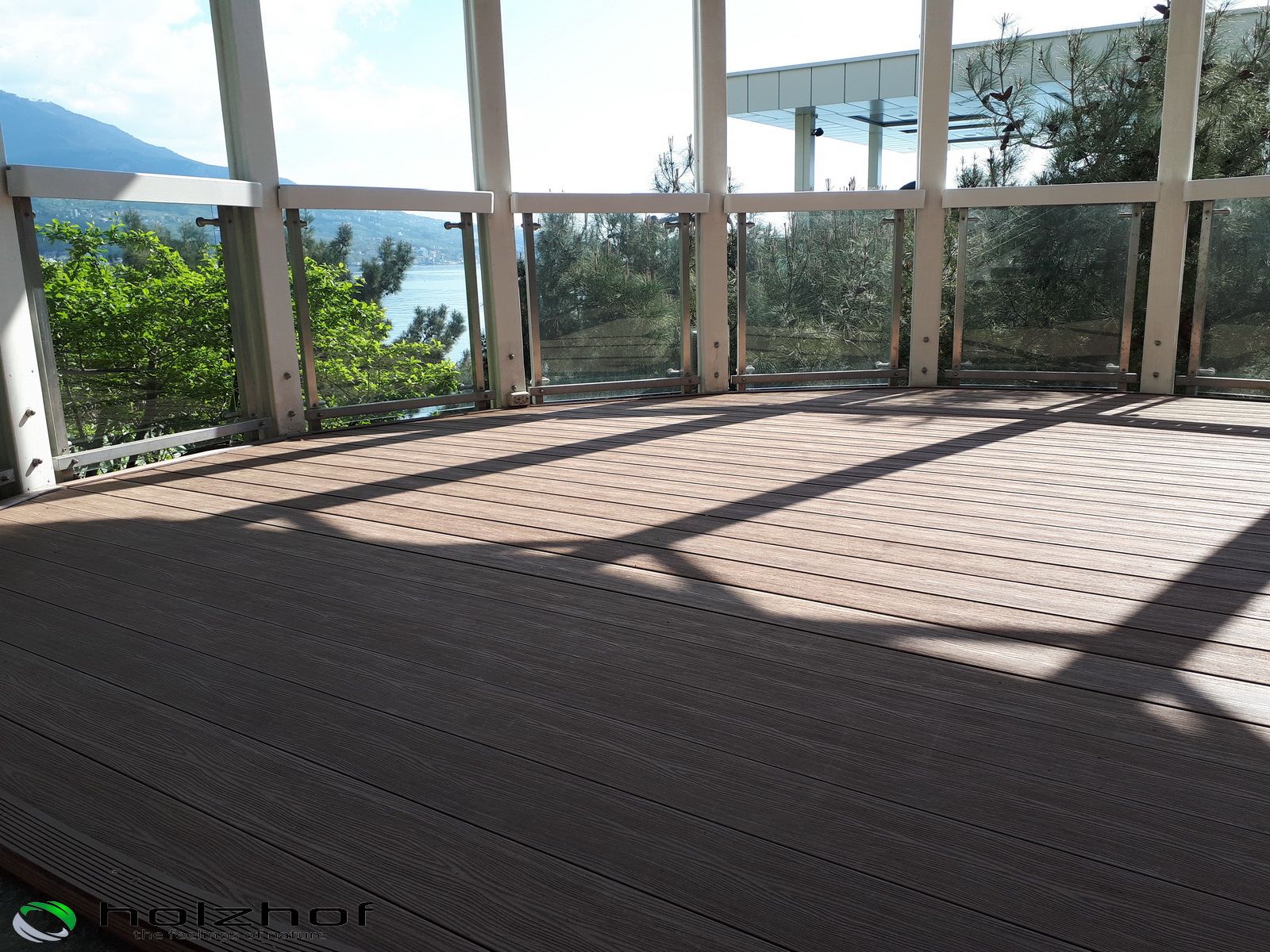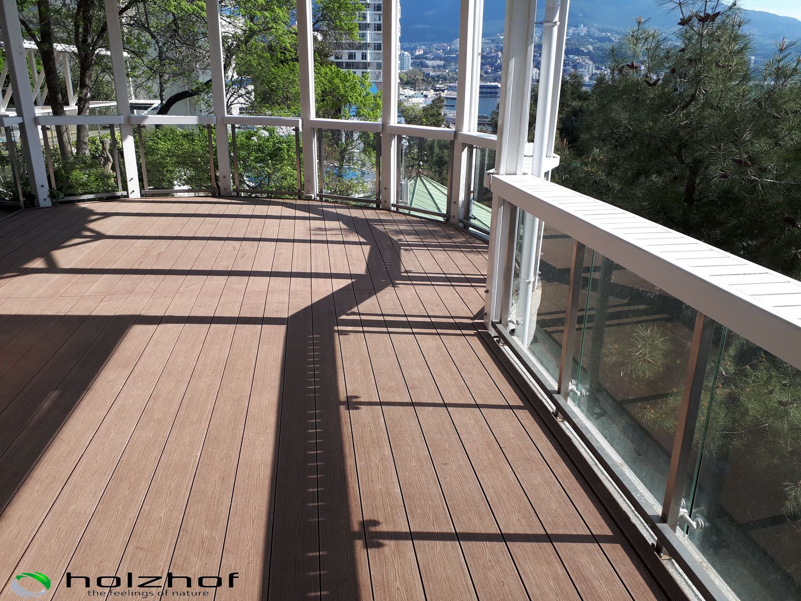 Именно по причине высокой проходимости и высокой нагрузки, для строительства смотровой площадки, необходимо применять только качественные и проверенные комплектующие, такие как: террасная доска Holzhof (коричневого цвета) на основе полиэтилена с глубоким 3D тиснением, которая и стала настоящим украшением пола. Также была применена высокопрочная Лага из ДПК с двумя ребрами жесткости и, конечно же, современная 3D клипса HILST.